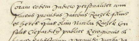 Z księgi ławniczej Kleparza obejmującej sprawy z lat 1528–1553: fragment wpisu z 1552 roku dotyczącego sprawy z udziałem przyszłego rajcy Jakuba Raczka (nr 83), syna zmarłego Mikołaja Raczka, rajcy kleparskiego - oraz zbliżenie zapisu imienia i urzędu (Archiwum Narodowe w Krakowie, sygn. KL 2, s. 634)