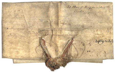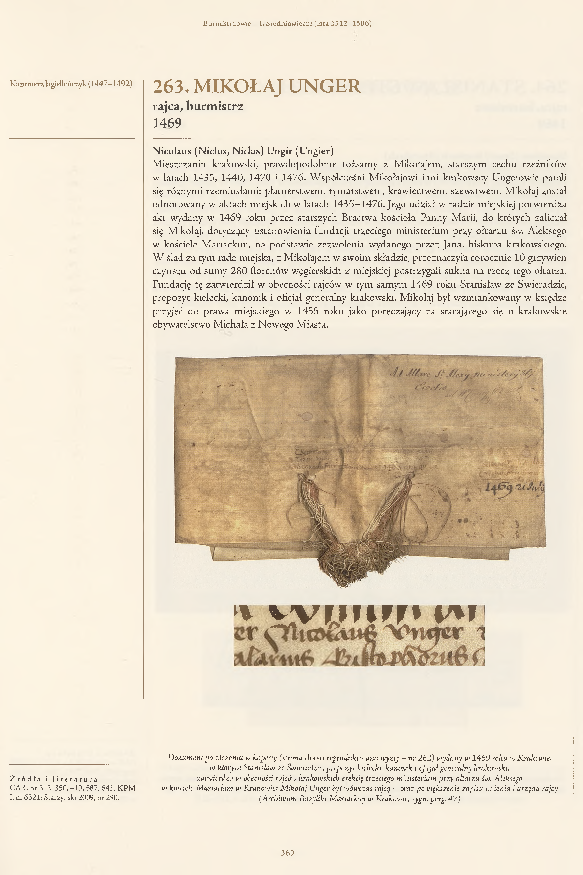 Dokument po złożeniu w kopertę (strona dorso reprodukowana wyżej – nr 262) wydany w 1469 roku w Krakowie, w którym Stanisław ze Świeradzic, prepozyt kielecki, kanonik i oficjał generalny krakowski, zatwierdza w obecności rajców krakowskich erekcję trzeciego ministerium przy ołtarzu św. Aleksego w kościele Mariackim w Krakowie; Mikołaj Unger był wówczas rajcą – oraz powiększenie zapisu imienia i urzędu rajcy (Archiwum Bazyliki Mariackiej w Krakowie, sygn. perg. 47)