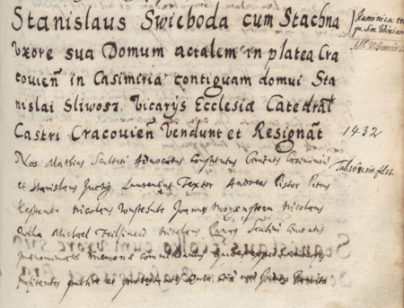 Z Liber inscriptionum… klasztoru oo. Augustianów w Kazimierzu: początkowy fragment dokonanego w roku 1681 wpisu przywołującego wydane w 1432 roku przez wójta i ławników kazimierskich, z Mikołajem Wieką w składzie, potwierdzenie sprzedaży przez Stanisława Swiebodę starszego (nr 124) i jego żonę Stachnę domu narożnego przy ul. Krakowskiej w Kazimierzu, przylegającego do domu Stanisława Śliwosza, na rzecz wikariuszy kościoła katedralnego w Krakowie – oraz zbliżenie zapisu imienia (Biblioteka Naukowa PAU/PAN, sygn. rkps 1676, s. 315)