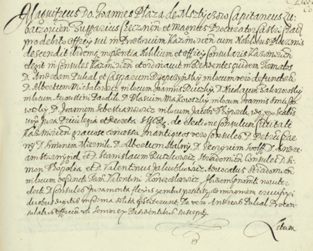 Z księgi radzieckiej Kazimierza obejmującej lata 1610–1612: wpis dokumentujący wybór rady urzędującej na rok 1611, z Mikołajem Zakrzewskim w składzie – oraz zbliżenie zapisu imienia (Archiwum Narodowe w Krakowie, sygn. K 31, s. 605)
