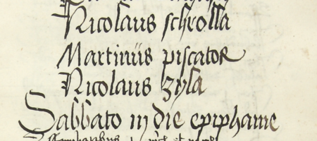 Z księgi radzieckiej Kazimierza obejmującej lata 1481–1508: fragment wpisu dokumentującego wybór rady urzędującej na rok 1487, z Mikołajem Zylą w składzie – oraz zbliżenie zapisu imienia (Archiwum Narodowe w Krakowie, sygn. K 7, s. 107)