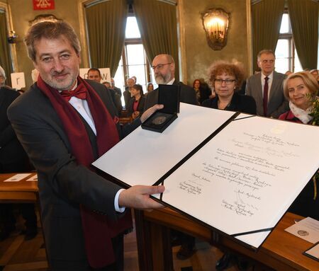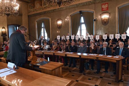 Z uroczystości wręczenia medalu z dyplomem 11 grudnia 2019 r. w Pałacu Wielopolskich. Prezentacja wyróżnienia przez dyrektora Muzeum Krakowa Michała Niezabitowskiego oraz logo laureata.