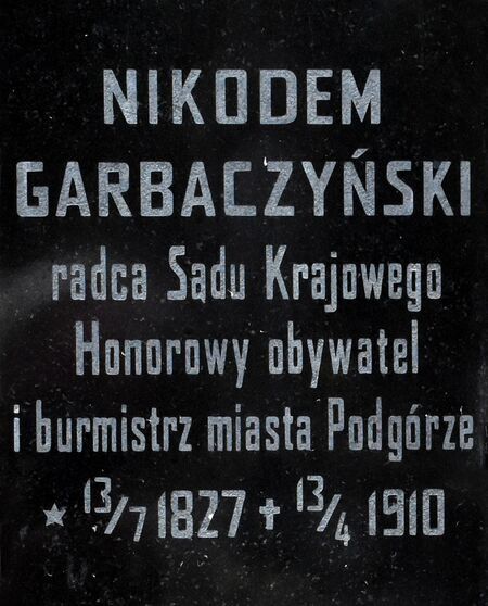 Nikodem Garbaczyński, prawnik, sędzia, radca dworu, burmistrz miasta Podgórza. Urodzony 13 lipca 1828 r. w Sepicy w powiecie ropczyckim, syn Macieja, dzierżawcy dóbr. Po ukończeniu prawa na Uniwersytecie Jagiellońskim w 1854 r. został praktykantem konceptualistą w magistracie bocheńskim, następnie zajął w Rzeszowie stanowisko radcy sądowego i zastępcy asesora sądu powiatowego w sprawach dochodów skarbowych. W latach 1879–1892 był radcą Sądu Krajowego Wyższego w Krakowie. W roku 1893 otrzymał tytuł radcy dworu. Od 1896 r. w składzie Rady Miejskiej Podgórza, rok później wybrany podgórskim burmistrzem. Wchodził wówczas w skład rady powiatowej w Wieliczce, był prezesem Kasy Oszczędności Miasta Podgórza oraz prezesem Towarzystwa Upiększania Miasta Podgórza. W 1900 r. ustąpił z burmistrzowskiego stanowiska. Należał do niego dom przy ul. Mickiewicza (obecnie Zamoyskiego). Żonaty z Bronisławą z Łopockich, po śmierci żony, nie mając własnych dzieci, zaopiekował się Celiną Garbaczyńską, córką zmarłego brata. Zmarł 13 kwietnia 1910 r.; pochowany na cmentarzu Rakowickim w Krakowie, następnie – dzięki staraniom Celiny – przeniesiony wraz z żoną na krakowski cmentarz Podgórski nowy.