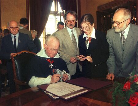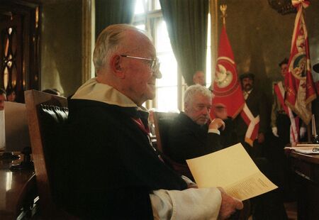 Z uroczystości wręczenia dyplomu honorowego obywatelstwa 5 czerwca 1999 r. w Pałacu Wielopolskich. Ks. Adam Franciszek Studziński w gabinecie prezydenta miasta oraz własnoręczny podpis uhonorowanego.