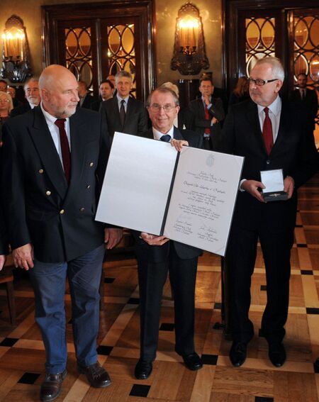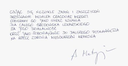 Prezentacja medalu i dyplomu przez aktualnego prezesa Izby oraz jego poprzedników w krakowskim samorządzie lekarskim: Jana Ciećkiewicza (w środku) i Bogdana Badowskiego (z lewej); reprodukcja wpisu do Księgi Medalu „Cracoviae Merenti”.