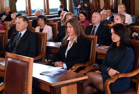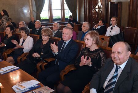 Z uroczystości wręczenia medalu z dyplomem 3 października 2018 r. w Pałacu Wielopolskich. Wystąpienie dziekana Rady Okręgowej Izby Marcina Sali-Szczypińskiego oraz logo laureata.