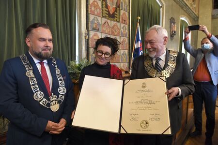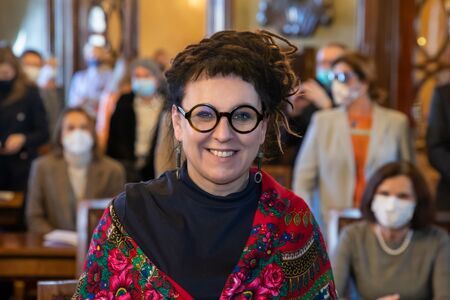 Z uroczystego wręczenia dyplomu honorowego obywatelstwa 8 października 2021 r. Olga Tokarczuk podczas uroczystości w Sali Obrad RMK oraz własnoręczny podpis uhonorowanej.