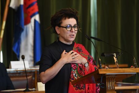Prezentacja oryginału dyplomu przez Olgę Tokarczuk w towarzystwie przewodniczącego RMK i prezydenta miasta, wystąpienie z mównicy prezydialnej oraz składanie podpisu na duplikacie dyplomu.