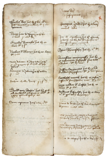 Z księgi przyjęć do prawa miejskiego w Krakowie obejmującej lata 1423–1493 strony 128–129 z wpisem stwierdzającym przyjęcie przez Pawła Bera prawa miejskiego w Krakowie w 1446 roku – oraz powiększenie zapisu imienia (Archiwum Państwowe w Krakowie, sygn. rkps 1421, s. 128–129)