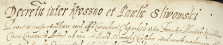 Z akt sądowych wielkorządcy krakowskiego obejmujących lata 1584–1591: początkowy fragment wpisu z 1589 roku dotyczącego sprawy z wniosku Marcina Kroszny o roszczenie spadkowe po zmarłym Kasprze Sadowniku, z udziałem rajcy Pawła Śliwowskiego jako wykonawcy testamentu tegoż Kaspra – oraz zbliżenie zapisu imienia i urzędu (Archiwum Narodowe w Krakowie, sygn. Teut. 68, s. 552)