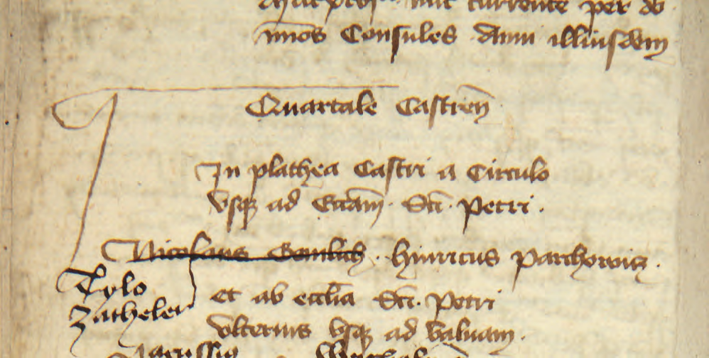 Z najstarszej księgi radzieckiej Krakowa z lat 1392–1411 wpis z 1396 r. dotyczący ustanowienia starszych dla Kwartału Grodzkiego. Wpis ten zawiera dwa składy starszych: pierwotny z 1396 r. oraz późniejszy, uwidoczniony skreśleniami i dopiskami uczynionymi w całym dokumencie dla wszystkich kwartałów jedną ręką, w jednym czasie, zatem po zmianach personalnych, które musiały mieć miejsce po roku 1396 – stąd powyżej dwa składy. Jednocześnie wpis ten jest fragmentem najstarszego zachowanego zapisu o istnieniu w Krakowie podziału miasta na kwartały (Archiwum Narodowe w Krakowie, sygn. rkps 427, s. 68)