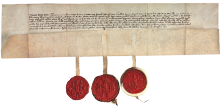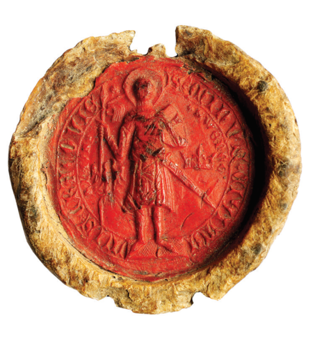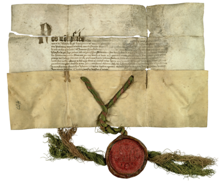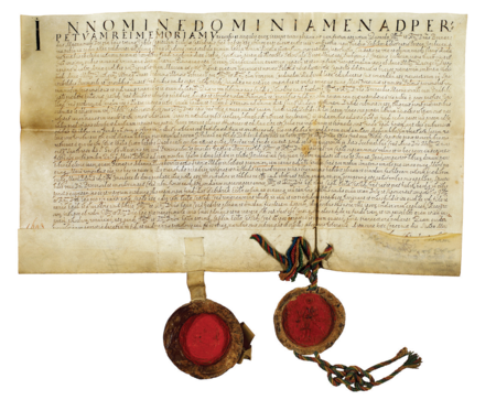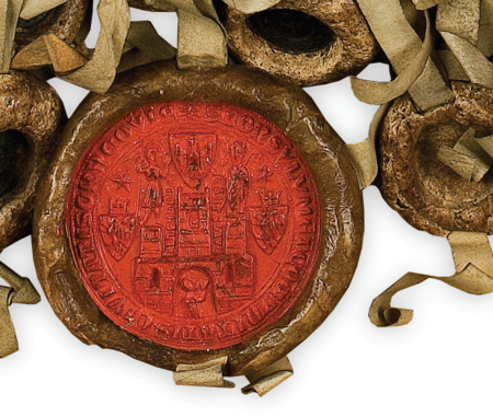 (052–053) Dokument pergaminowy wystawiony w 1343 r. w Krakowie przez trzy miasta małopolskie: Kraków, Sandomierz i Nowy Sącz, mocą którego miasta te udzieliły gwarancji traktatowi zawartemu kilka dni wcześniej w Kaliszu przez Kazimierza Wielkiego z zakonem krzyżackim. Tu także zbliżenie pieczęci, którą opatrzono ten dokument – najstarszy zachowany egzemplarz odcisku pierwszej pieczęci większej miasta i rady. Pieczęć ta powstała z przerobienia pieczęci miasta i wójta (zob. il. 047) po obniżeniu rangi tego urzędu w 1312 r. Na tym samym tłoku (a zatem o średnicy 65 mm) dodano sześciopromienne gwiazdy nad bocznymi tarczami (jako symbol szczęścia albo jedynie jako wyróżniający ozdobnik) oraz zmieniono treść napisu w otoku, który teraz brzmiał: S[IGILLVM] CONSVLVM ET COMVNITATIS CIVITATIS CRACOVIE (pieczęć rajców i mieszczaństwa [pospólstwa] miasta Krakowa). Urzędowo była używana jeszcze w pierwszej połowie XV w., a także dużo później, lecz już w wymiarze historycznego symbolu; w 1895 r. sporządzono replikę jej tłoku (zob. il. 002) i rozpoczęła służbę „ceremonialną” – opatrywano nią najważniejsze miejskie akty okolicznościowe czy honorowe; praktyka ta przetrwała do dzisiaj (Berlin-Dahlem, Geheimes Staatsarchiv Preußischer Kulturbesitz, XX. HA Scheibl. 109, nr 4)