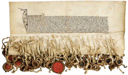 (056–057) Dokument pergaminowy wystawiony w 1430 r. przez króla Władysława Jagiełłę w Jedlni, mocą którego w zamian za sukcesję na tronie dla swojego potomka król nadał szlachcie przywileje. Wśród przywieszonych pieczęci magnatów polskich i szlachty, w centralnym punkcie, znajduje się odcisk w wosku pieczęci krakowskiej – Kraków reprezentował przy tym akcie miasta polskie. Tu także zbliżenie pieczęci, którą opatrzono ten dokument – chronologicznie jest to trzeci z zachowanych egzemplarzy odcisku najstarszej pieczęci większej miasta – radzieckiej; zob. il. 053 (MNK, nr inw. 17-perg-368.5024)