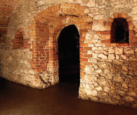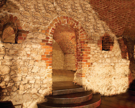 (050) Zachowana oryginalna część muru frontowego wieży wójtowskiej, o której wyżej mowa, z charakterystycznym wejściem i bocznymi oknami. Jest to dawny parter, choć obecnie – ze względu na podnoszenie się przez wieki poziomu ulicy – znajduje się on w piwnicach kamienicznych. Obiekt datowany jest na koniec XIII stulecia, mógł istnieć w latach 80. tegoż wieku, gdy powstawała najstarsza pieczęć miasta i wójta Krakowa (z zasobów UMK)