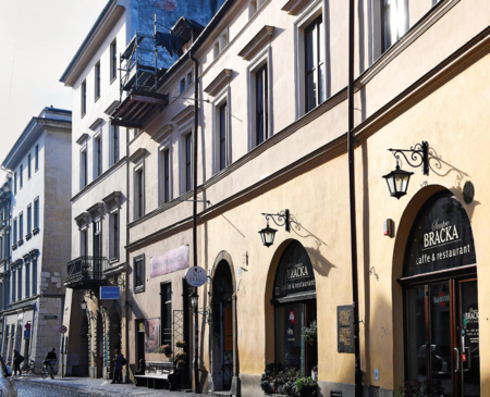 (048) Ulica Bracka w kierunku zbiegu z ul. Gołębią, kamienice nr 3–5; w średniowieczu była tam duża parcela, na której stała siedziba krakowskiego wójta dziedzicznego w kształcie wieży, obiekt reprezentacyjno- mieszkalny, który mógł posłużyć w latach 80. XIII w., z braku jeszcze murów obronnych miasta, za pierwowzór czy inspirację dla wizerunku muru na najstarszej pieczęci miasta i jego wójta – zob. il. 047 (z zasobów UMK)
