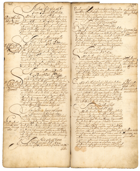 (065) Strony z miejskiej księgi radzieckiej, gdzie znajduje się wpis w języku łacińskim z 1621 r., dotyczący nowej pieczęci miasta, o treści: Działo się w najbliższy poniedziałek przed świętem św. Elżbiety [15 XI] roku Pańskiego 1621. Przesławni panowie Maciej Wojeński burmistrz, Krzysztof Szober, Stanisław Rapp, Ludwik Cromer, Zygmunt Alantsee, Krzysztof Słowikowski, Jan Wisembergk, Mikołaj Pernus i Grzegorz Klausuic, rajcy urzędujący, zostali wezwani dziś pisemnie na posiedzenie i zgromadzili się w ratuszu krakowskim, aby podczas obrad podjąć dojrzałe decyzje i przywrócić dawną świetność tego miasta przez wzbogacenie jego znaków – nie tylko wśród innych [miejskich] oraz szlacheckich, ale także obcych, teraz bowiem przez pewną zmianę znak miasta jest uszczuplony. Aby więc przez miłość do tego miasta ozdobić je i dawną godność przywrócić, jednogłośnie wyrazili i postanowili, że znakiem, czyli pieczęcią miasta, które uznawane jest jako stołeczne przez swoje liczne zasługi dla Rzeczypospolitej, będą trzy czerwone wieże wraz z koroną jako znak stołecznego i pierwszego z miast Królestwa, co też postanowiono i sprawiono (tłum. Marcin Starzyński) (ANK, sygn. rkps 1213, s. 306–307)