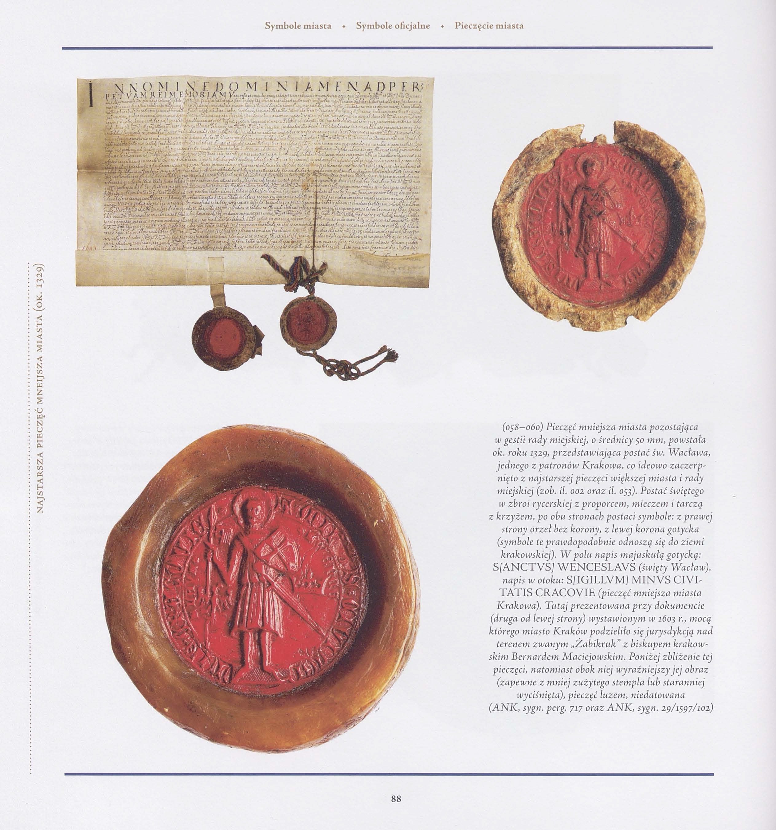 (058–060) Pieczęć mniejsza miasta pozostająca w gestii rady miejskiej, o średnicy 50 mm, powstała ok. roku 1329, przedstawiająca postać św. Wacława, jednego z patronów Krakowa, co ideowo zaczerpnięto z najstarszej pieczęci większej miasta i rady miejskiej (zob. il. 002 oraz il. 053). Postać świętego w zbroi rycerskiej z proporcem, mieczem i tarczą z krzyżem, po obu stronach postaci symbole: z prawej strony orzeł bez korony, z lewej korona gotycka (symbole te prawdopodobnie odnoszą się do ziemi krakowskiej). W polu napis majuskułą gotycką: S[ANCTVS] WENCESLAVS (święty Wacław), napis w otoku: S[IGILLVM] MINVS CIVITATIS CRACOVIE (pieczęć mniejsza miasta Krakowa). Tutaj prezentowana przy dokumencie (druga od lewej strony) wystawionym w 1603 r., mocą którego miasto Kraków podzieliło się jurysdykcją nad terenem zwanym „Żabikruk” z biskupem krakowskim Bernardem Maciejowskim. Poniżej zbliżenie tej pieczęci, natomiast obok niej wyraźniejszy jej obraz (zapewne z mniej zużytego stempla lub staranniej wyciśnięta), pieczęć luzem, niedatowana (ANK, sygn. perg. 717 oraz ANK, sygn. 29/1597/102)