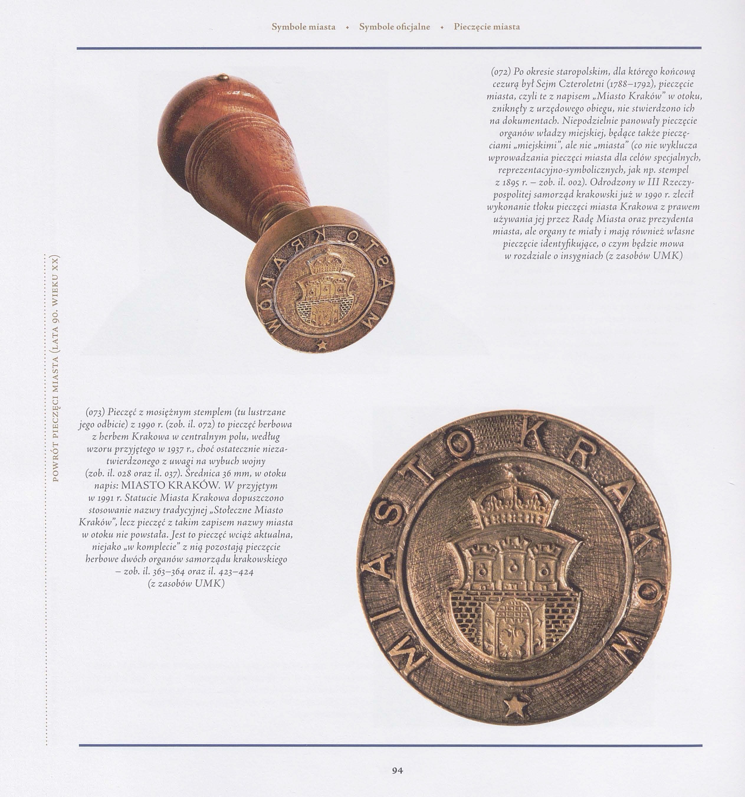 (074) Statut Miasta Krakowa przyjęty przez Radę Miasta Krakowa w 1996 r. dopuścił stosowanie tradycyjnej nazwy miasta w brzmieniu: „Stołeczne Królewskie Miasto Kraków”. Z kolei uchwała Rady Miasta Krakowa z 2002 r. w sprawie symboli Krakowa, formułując ich oficjalny katalog, sytuuje wśród nich pieczęć miasta. To, co było dorozumiane i osadzone w zwyczaju, z tą chwilą stało się umocowane w prawie lokalnym. Przywołana tu uchwała z 2002 r. jednocześnie określiła obowiązujący wzór pieczęci miasta – na ilustracji graficzne przedstawienie pieczęci z załącznika do tej uchwały; herb miasta co do zasady oparty jest na wzorze z 1937 r. (przyjętym także w roku 1990 i usankcjonowanym uchwałą Rady Miasta Krakowa z 1991 r., lecz już z korektami wprowadzonymi w roku 2002) – zob. il. 028 oraz il. 037–038 (z zasobów UMK)
