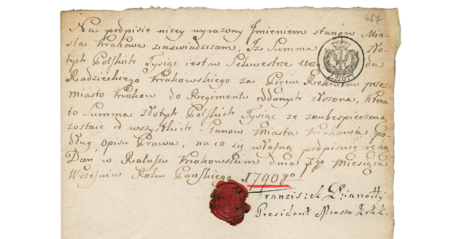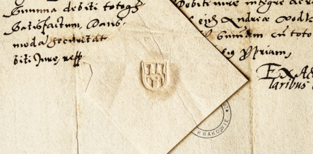 Od lokacji Krakowa w 1257 r. do granicznego roku 1312 zidentyfikowano rządy ośmiu znanych z imienia wójtów krakowskich (por. Poczet 2010, s. 107–114). Z tych czasów znana jest tylko jedna pieczęć – to jednocześnie pieczęć i wójta, i miasta (w otoku łaciński napis, w tłumaczeniu: „pieczęć wójta miejskiego i mieszczan krakowskich”), powstała ok. 1281/1283 roku, znana obecnie tylko w przerysie z dokumentu wystawionego w 1303 r. Pieczęć ta reprezentuje równocześnie dwa podmioty i dlatego była ona symbolem miasta, a zarazem insygnium jego wójta. Przedstawiono ją już wcześniej w szczegółach (zob. il. 001 oraz il. 046–051), tutaj prezentujemy pełny obraz karty z jej przerysem dokonanym w latach 30. XX w. przez Kajetana Kielisińskiego (oraz z tekstem odautorskim); obiekt obecnie znajduje się w Bibliotece Kórnickiej PAN (zob. il. 404).