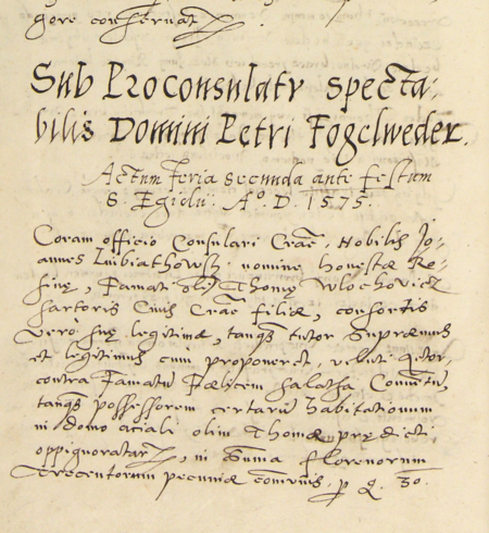 Z księgi radzieckiej obejmującej lata 1575–1580 fragment strony 100 z nagłówkiem otwierającym wpisy spraw prowadzonych za kadencji burmistrzowskiej Piotra Fogelwedera w 1575 roku – oraz powiększenie zapisu imienia i funkcji burmistrza (Archiwum Państwowe w Krakowie, sygn. rkps 447, s. 100)