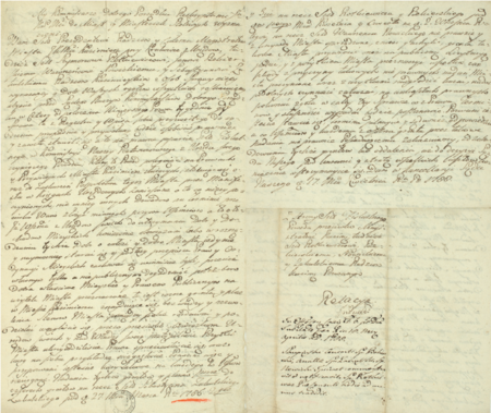 Z akt komisji dobrego porządku obejmujących lata 1786–1791: pozew sformułowany przez komisarzy w 1788 roku przeciwko rajcom urzędującym w 1786 roku, wśród nich Piotrowi Wawrzyńcowi Nowickiemu, o zawłaszczenie nieruchomości miejskich – oraz zbliżenie zapisu imienia (Archiwum Narodowe w Krakowie, sygn. K 841, s. 1–2)
