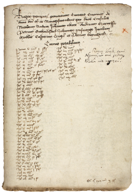 Z księgi miejskiej rachunkowej zawierającej wpisy z lat 1395–1399 strona 185 z wpisem otwierającym rejestr wydatków i dochodów z 1398 roku, gdzie zostali wymienieni urzędujący ówcześnie rajcy, wśród których znajdował się Piotr Weyngart – oraz powiększenie zapisu imienia (Archiwum Państwowe w Krakowie, sygn. rkps 1589, s. 185)