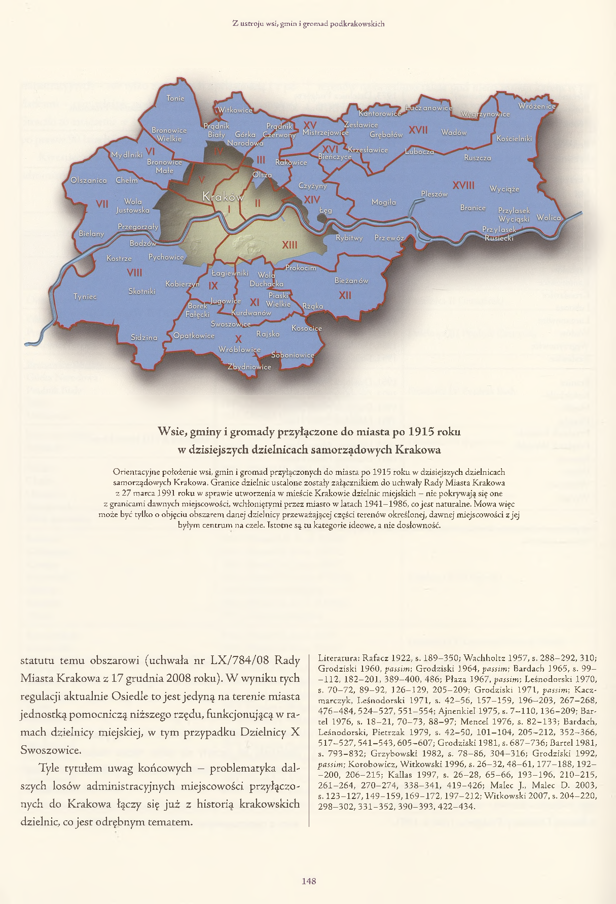 Wsie, gminy i gromady przyłączone do miasta po 1915 roku w dzisiejszych dzielnicach samorządowych Krakowa Orientacyjne położenie wsi, gmin i gromad przyłączonych do miasta po 1915 roku w dzisiejszych dzielnicach samorządowych Krakowa. Granice dzielnic ustalone zostały załącznikiem do uchwały Rady Miasta Krakowa z 27 marca 1991 roku w sprawie utworzenia w mieście Krakowie dzielnic miejskich – nie pokrywają się one z granicami dawnych miejscowości, wchłoniętymi przez miasto w latach 1941–1986, co jest naturalne. Mowa więc może być tylko o objęciu obszarem danej dzielnicy przeważającej części terenów określonej, dawnej miejscowości z jej byłym centrum na czele. Istotne są tu kategorie ideowe, a nie dosłowność.