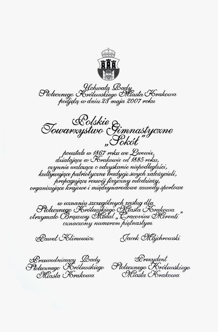 Brązowy medal nr 15 przyznany uchwałą Rady Miasta Krakowa nr XIV/173/07 podjętą 23 maja 2007 r., gdy urząd prezydenta miasta pełnił Jacek Majchrowski, a Radzie przewodniczył Paweł Klimowicz. Uhonorowanie to zbiegło się z jubileuszem 140-lecia powstania na ziemiach polskich organizacji sokolej. Wręczenie medalu wraz z dyplomem nastąpiło 30 października 2007 r. podczas uroczystej sesji Rady Miasta Krakowa w sali Obrad RMK w Pałacu Wielopolskich w Krakowie, co uwieczniono w Księdze Medalu „Cracoviae Merenti”.