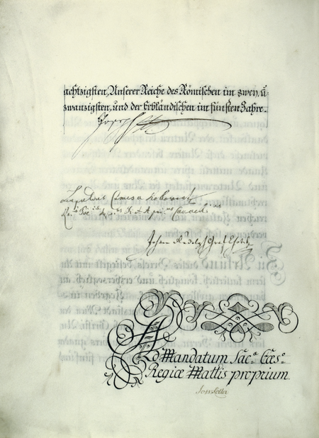 Strony z dokumentu wydanego w 1785 roku w Wiedniu, mocą którego cesarz Józef II potwierdził wcześniejsze wyniesienie osady Podgórze do rzędu królewskich miast z wolnohandlowymi prawami i przyznające jego mieszkańcom wolności i prawa wymienione w dziewięciu punktach. Jednocześnie cesarz nadał miastu herb z wizerunkiem swoich ukoronowanych inicjałów nad warowną bramą z wieżami i z napisem w otoku: SIGILL[UM] LIBER[AE] ET REG[IAE] CIVITATIS PODGORCZEN[SIS] – PIECZĘĆ WOLNEGO I KRÓLEWSKIEGO MIASTA PODGÓRZA – oraz zbliżenie wizerunku herbu (Archiwum Narodowe w Krakowie, sygn. perg. 1106)