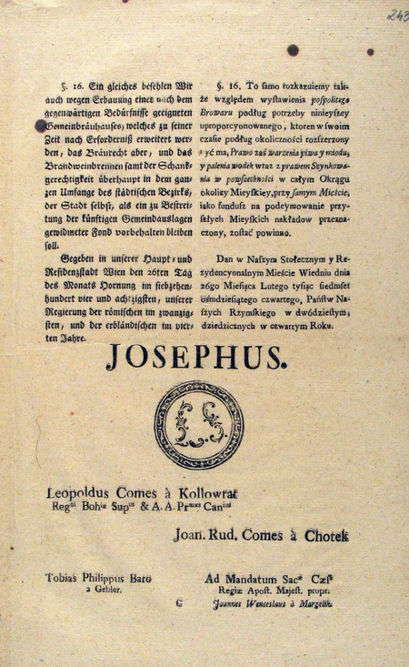 My Jozef Wtory z Bożej łaski obrany cesarz rzymski po wsze czasy pomnożyciel Rzeszy, król niemiecki, wękierski y czeski, Galicji y Lodomeryi etc. arcy-xiąże Austryi, xiąże Burgundyi y Lortharyngii, etc. Pożytki, które okolica Podgórza dla swego dobrego położenia między Szląskiem, Polską y Węgrami, y dla bliskości Wisły, do założenia różnych manufaktur y użyteczney sprzedaży onychże, pod rękę podaje, y które już znaczną liczbę obcych rękodzielników y kupców do osiadania tamże y do stawiania licznych domów zachęciły, były Nam powodem dla ozywienia narodowej pilności y handlu, Podgórze samo rozprzestrzenić y tytułem Królewskiego Miasta zaszczycić, gdzie obcy tamże osiadający, nie tylko chętnie przyjęci, ale też onymże protekcya, dzielna pomoc, wolność y swobody nadane będą. § 1. Podgórze więc wraz z osiadłością tamże naydującą się y obszernością mieysca do rozszerzenia onegogoż między nim y Ludwinowem wyznaczonego, zachowując go przy teraźniejszym nazwisku, Miastem Wolnym Królewskim ogłaszamy, które pod dozorem y zarządzaniem Naszych Rządów Krajowych, wolnościami y prawami wszystkich innych królewskich wolnych miast zaszczycać się ma y jak tylko tamże przyzwoity magistrat ustanowiony będzie, tak jako Nasze Królewskie Stołeczne Miasto Lwów prawo mieć ma, do obrad stanów z pomiędzy siebie deputatów głos y mieyscew zabierających tak jako y inne stany krajowe, wysyłać (z powyższego dokumentu początkowy fragment, s. 235–236).