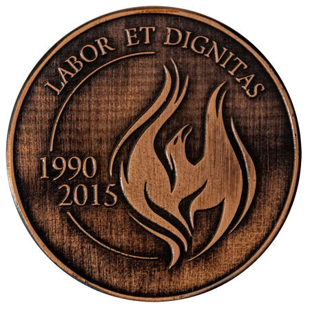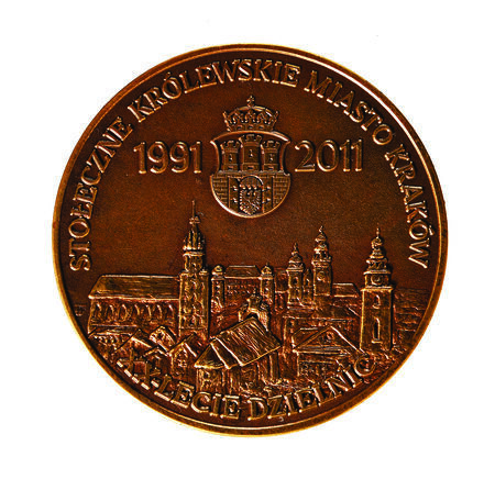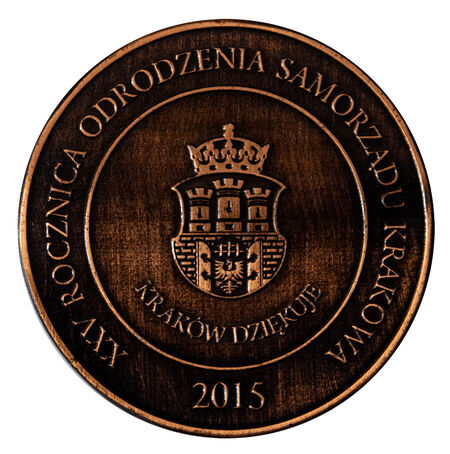 Awers i rewers pamiątkowego medalu wybitego w 2015 roku w 25. rocznicę odrodzenia samorządu Krakowa. Na awersie herb miasta z napisem: KRAKÓW DZIĘKUJE, na rewersie lata 1990 i 2015 oraz jako symbol odrodzenia sylwetka mitycznego feniksa w płomieniu skierowanym ku górnemu napisowi: LABOR ET DIGNITAS (praca i godność), co nawiązuje do dwóch rzeźbionych w kamieniu postaci z portalu wejściowego do Pałacu Wielopolskich, personifikujących pracę i godność.