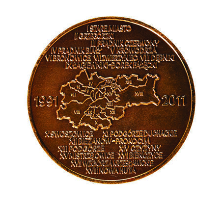 Awers i rewers pamiątkowego medalu wybitego w 2011 roku w 20-lecie dzielnic Krakowa. Na awersie pod herbem miasta z podanymi latami 1991 i 2011 ukazano staromiejską panoramę, pod nią napis: XX-LECIE DZIELNIC. Na rewersie wyliczono 18 dzielnic samorządowych oraz oznaczono ich lokalizację na schematycznym planie miasta.