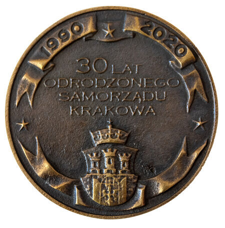 Awers i rewers pamiątkowego medalu wybitego 2020 roku w 30-lecie odrodzonego samorządu Krakowa. Na awersie górna wstęga z wpisanymi latami 1990 i 2020 oraz trzema gwiazdami symbolizującymi dokonane dekady samorządu, a także dolna wstęga z herbem miasta. Na rewersie dzierżąca tarczę z herbem Krakowa bogini Atena jako symbol demokracji i samorządności miejskiej, po jej prawej stronie wzbijająca się do lotu sowa utożsamiająca wiedzę i mądrość, po lewej stronie bryła kościoła Mariackiego. Inskrypcja w otoku w tłumaczeniu z łaciny głosi: „Kraków całej Polski miasto najsławniejsze”. Medal zaprojektował Jan Tutaj.
