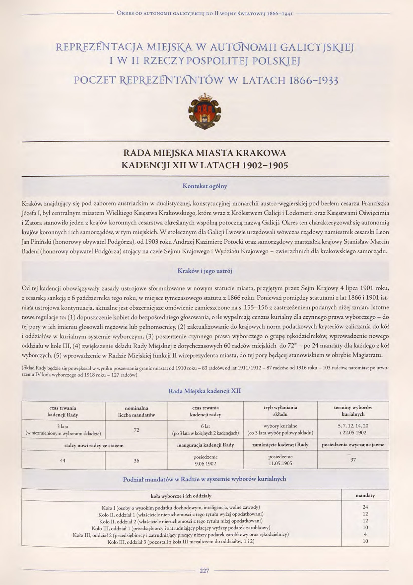 Od tej kadencji obowiązywały zasady ustrojowe sformułowane w nowym statucie miasta, przyjętym przez Sejm Krajowy 4 lipca 1901 roku, z cesarską sankcją z 6 października tego roku, w miejsce tymczasowego statutu z 1866 roku. Ponieważ pomiędzy statutami z lat 1866 i 1901 istniała ustrojowa kontynuacja, aktualne jest obszerniejsze omówienie zamieszczone na s. 155–156 z zastrzeżeniem podanych niżej zmian. Istotne nowe regulacje to: (1) dopuszczenie kobiet do bezpośredniego głosowania, o ile wypełniają cenzus kurialny dla czynnego prawa wyborczego – do tej pory w ich imieniu głosowali mężowie lub pełnomocnicy, (2) zaktualizowanie do krajowych norm podatkowych kryteriów zaliczania do kół i oddziałów w kurialnym systemie wyborczym, (3) poszerzenie czynnego prawa wyborczego o grupę rękodzielników, wprowadzenie nowego oddziału w kole III, (4) zwiększenie składu Rady Miejskiej z dotychczasowych 60 radców miejskich do 72* – po 24 mandaty dla każdego z kół wyborczych, (5) wprowadzenie w Radzie Miejskiej funkcji II wiceprezydenta miasta, do tej pory będącej stanowiskiem w obrębie Magistratu.