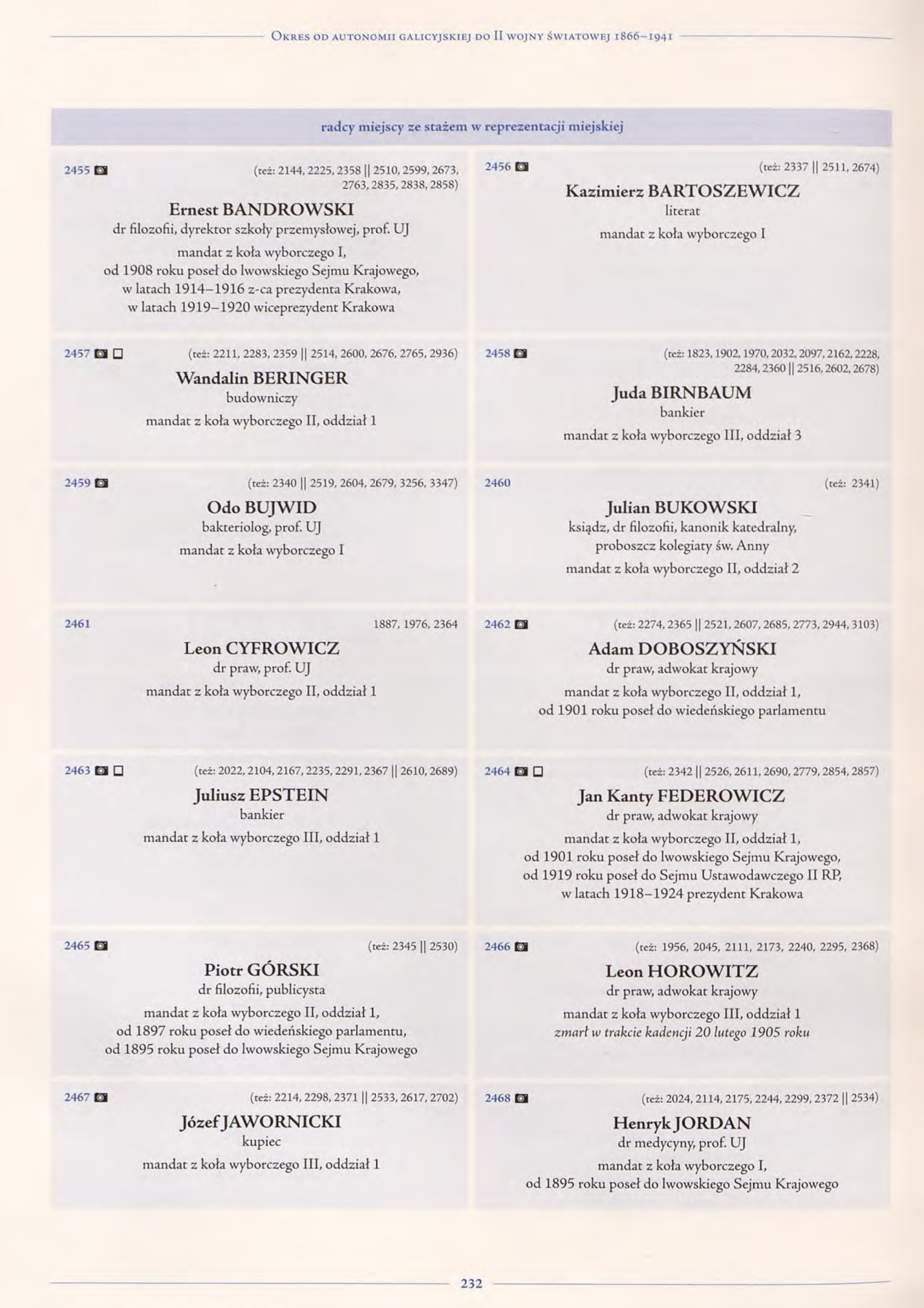 2406 (też: 1700, 1783, 1854, 1912, 1980, 2038, 2083, 2143, 2209, 2210, 2270, 2332) Józef FRIEDLEINksięgarz radca miejski, mandat z koła wyborczego III, oddział 1, w latach 1893–1904 prezydent Krakowa