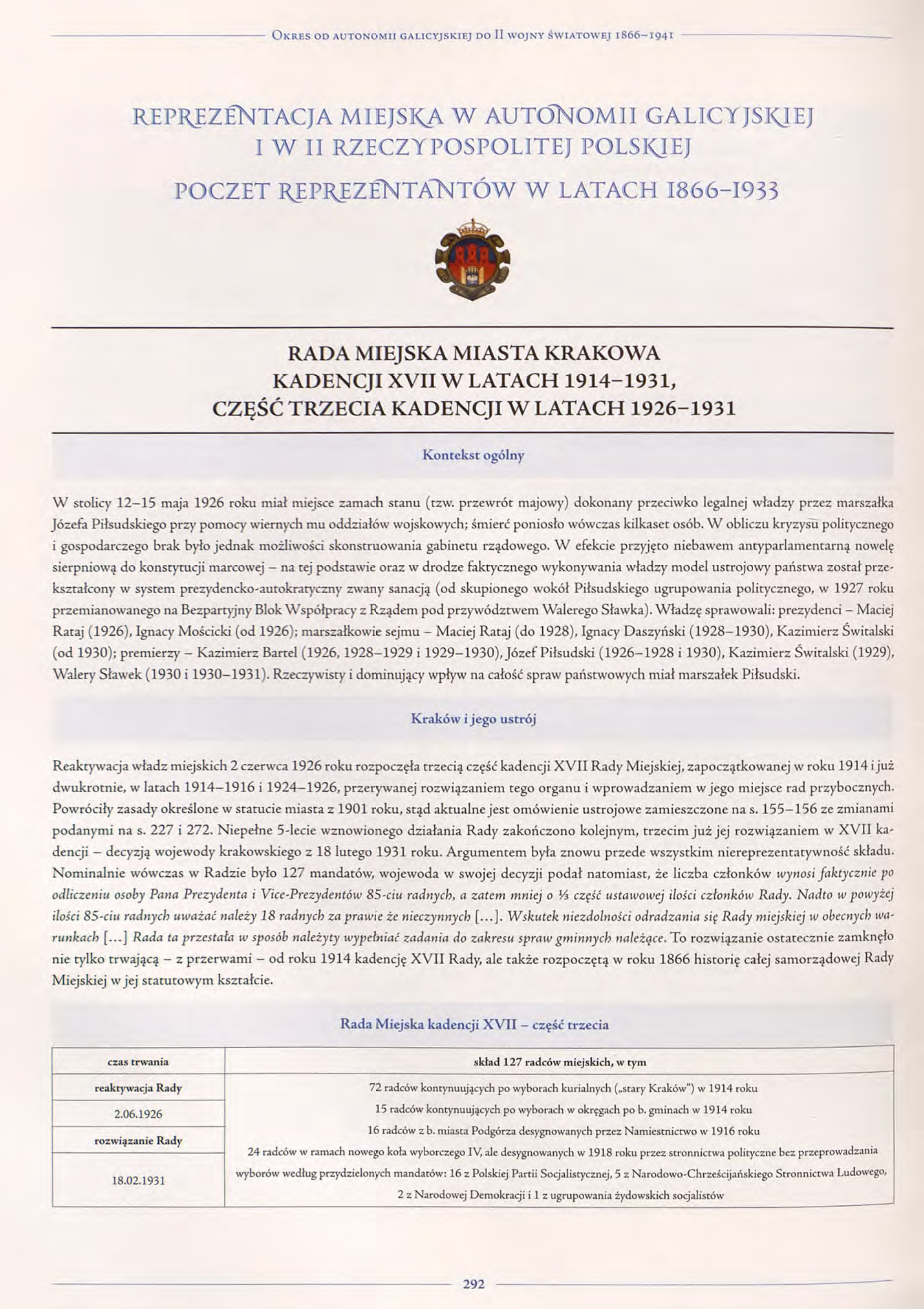 Reaktywacja władz miejskich 2 czerwca 1926 roku rozpoczęła trzecią część kadencji XVII Rady Miejskiej, zapoczątkowanej w roku 1914 i już dwukrotnie, w latach 1914–1916 i 1924–1926, przerywanej rozwiązaniem tego organu i wprowadzaniem w jego miejsce rad przybocznych. Powróciły zasady określone w statucie miasta z 1901 roku, stąd aktualne jest omówienie ustrojowe zamieszczone na s. 155–156 ze zmianami podanymi na s. 227 i 272. Niepełne 5-lecie wznowionego działania Rady zakończono kolejnym, trzecim już jej rozwiązaniem w XVII kadencji – decyzją wojewody krakowskiego z 18 lutego 1931 roku. Argumentem była znowu przede wszystkim niereprezentatywność składu. Nominalnie wówczas w Radzie było 127 mandatów, wojewoda w swojej decyzji podał natomiast, że liczba członków wynosi faktycznie po odliczeniu osoby Pana Prezydenta i Vice-Prezydentów 85-ciu radnych, a zatem mniej o ⅓ część ustawowej ilości członków Rady. Nadto w powyżej ilości 85-ciu radnych uważać należy 18 radnych za prawie że nieczynnych […]. Wskutek niezdolności odradzania się Rady miejskiej w obecnych warunkach […] Rada ta przestała w sposób należyty wypełniać zadania do zakresu spraw gminnych należące. To rozwiązanie ostatecznie zamknęło nie tylko trwającą – z przerwami – od roku 1914 kadencję XVII Rady, ale także rozpoczętą w roku 1866 historię całej samorządowej Rady Miejskiej w jej statutowym kształcie.