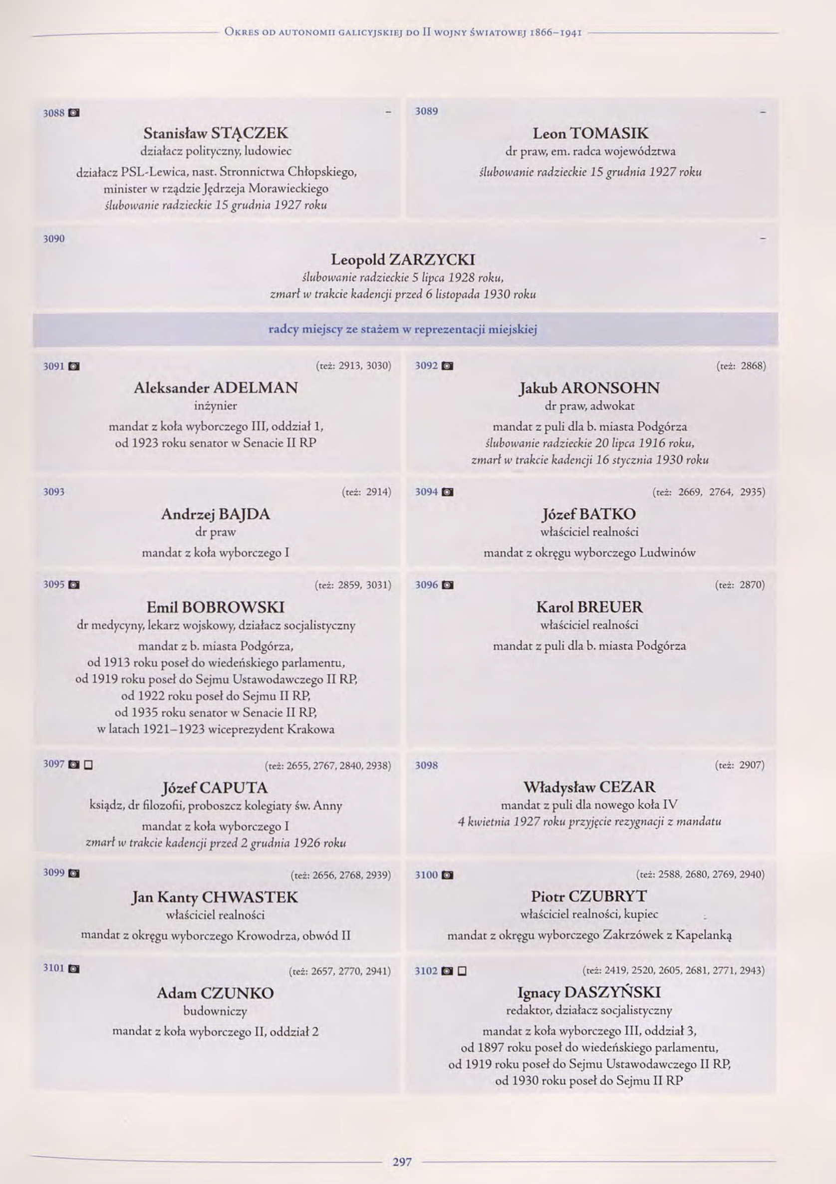 3053 (też: 2444, 2490, 2569, 2653, 2747, 2855, 2860, 3014 || 3055) Józef SAREinżynier, radca budownictwa radca miejski, mandat z koła wyborczego I, od 1907 roku poseł do lwowskiego Sejmu Krajowego, w latach 1924 i 1926 p.o. prezydenta Krakowa, w latach 1905–1914 i 1916–1929 wiceprezydent Krakowa
