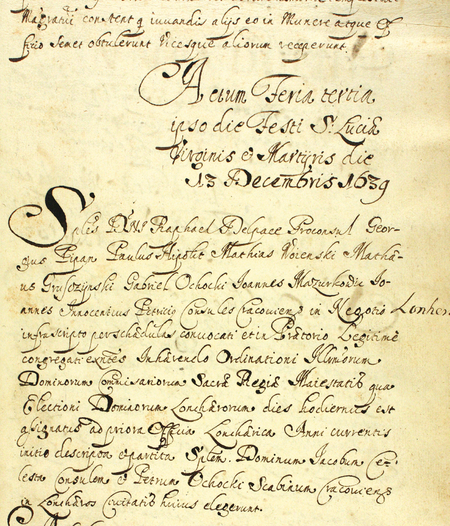 Z księgi radzieckiej dotyczącej administracji miasta obejmującej lata 1538–1643 fragment strony 545 z zapisem dokonanym w 1639 roku, za kadencji burmistrzowskiej Rafała Delpace, dotyczącym wyboru lonerów: rajcy Jakuba Celesty (nr 495) i ławnika Piotra Ochockiego – oraz powiększenie zapisu imienia i funkcji burmistrza (Archiwum Państwowe w Krakowie, sygn. rkps 1213, s. 545)