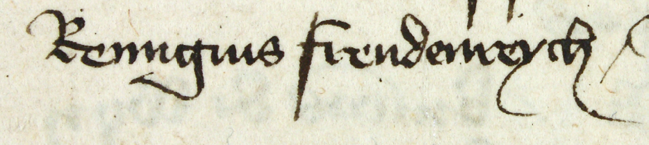 Z księgi radzieckiej obejmującej lata 1392–1411 strony 390–391 z wpisem z 1411 roku, zawierającym wykaz starszych i mistrzów cechowych, gdzie w środkowej części wymieniono starszych i mistrzów malarzy, szklarzy i stolarzy, wśród których znajduje się Remigiusz Freodenrich – oraz powiększenie zapisu imienia (Archiwum Państwowe w Krakowie, rkps 427, s. 390–391)