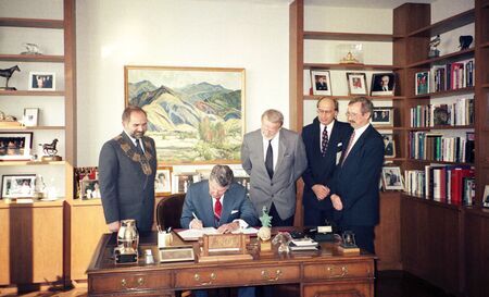 W gabinecie wręczenie dyplomu honorowego obywatelstwa przez prezydenta miasta i przewodniczącego RMK, obok prezydenta USA Tomasz Trafas, pracownik Konsulatu Generalnego RP w Los Angeles, brat Kazimierza Trafasa, byłego przewodniczącego Komisji Spraw Zagranicznych Rady Miasta Krakowa I kadencji; niżej duplikat dyplomu oraz złożenie przez Ronalda Reagana podpisu na tym duplikacie.
