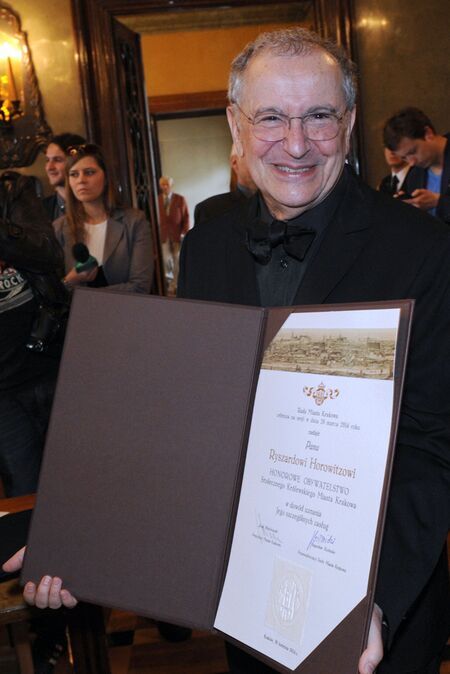 Z uroczystego wręczenia dyplomu honorowego obywatelstwa 30 kwietnia 2014 r. w Pałacu Wielopolskich. Ryszard Horowitz w Sali Obrad RMK oraz własnoręczny podpis uhonorowanego.