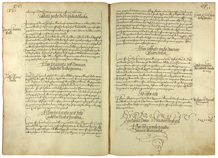 Z księgi radzieckiej obejmującej lata 1598–1601 strony 66–67 z nagłówkiem otwierającym wpisy spraw prowadzonych za kadencji burmistrzowskiej Sebastiana Przybytka w 1598 roku – oraz powiększenie zapisu imienia i funkcji burmistrza (Archiwum Państwowe w Krakowie, sygn. rkps 455, s. 66–67)