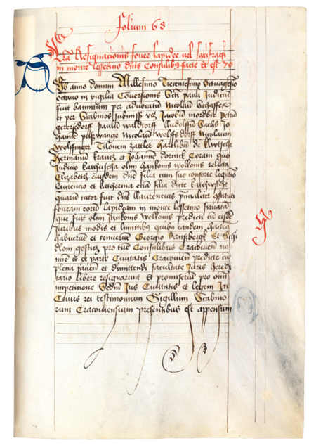 Z Kodeksu Behema kopia dokumentu z 1388 roku, dotyczącego przekazania przez Katarzynę, wdowę po Janie zwanym Wilkiem, oraz jej córki: Elżbietę i Katarzynę, spichlerza drewnianego położonego na wzgórzu Lasoty na rzecz miasta, reprezentowanego przez rajców: Jerzego Arnsberga starszego (nr 123) i Seidela Gosticza, co działo się w trakcie posiedzenia sądu ławniczego pod przewodnictwem wójta sądowego Mikołaja Schaffera – oraz powiększenie zapisu imienia (Biblioteka Jagiellońska, sygn. rkps 16, k. 68)