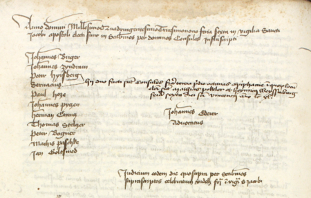 Z księgi ławniczej obejmującej lata 1431–1446 fragment strony 180 z wpisem zawierającym wykaz rajców powołanych do rady miejskiej na 1440 rok – oraz powiększenie zapisu imienia (Archiwum Państwowe w Krakowie, sygn. rkps 6, s. 180)