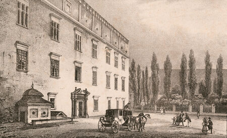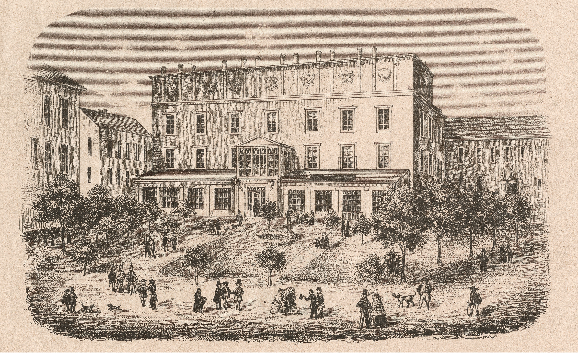 Dawny Pałac Wielopolskich: u góry z lewej strony na litografii Jana Nepomucena Głowackiego z ok. 1833 roku, gdy znajdował się jeszcze w rękach Wielopolskich; z prawej strony pałac na litografii nieznanego autora z 1860 roku, tuż przed zakupem przez gminę, widoczna nowa fasada po pożarze z 1850 roku oraz dobudowany pawilon kawiarni Wintera.