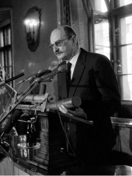 Z uroczystości wręczenia dyplomu honorowego obywatelstwa 20 czerwca 1990 r. w Pałacu Wielopolskich. Sławomir Mrożek w sali Obrad RMK oraz własnoręczny podpis uhonorowanego.