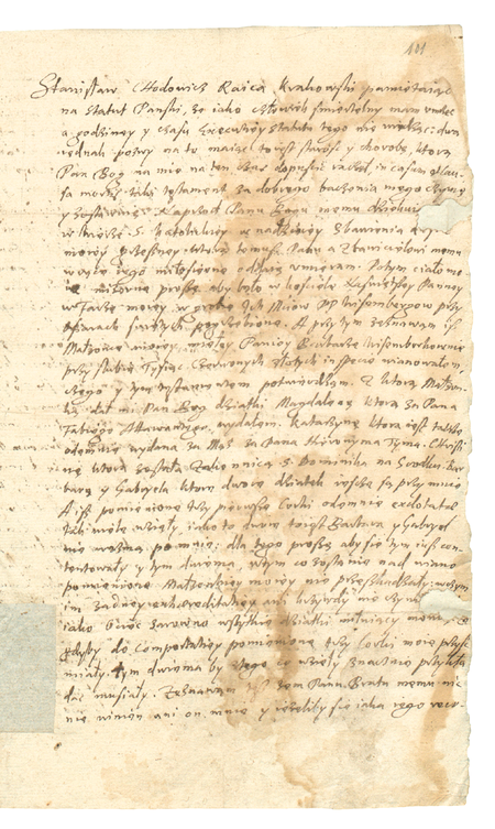 Pierwsza i ostatnia strona testamentu Stanisława Chodowicza, który podyktował 20 lutego 1641 roku, na krótko przed śmiercią, „dwa pozwy na to mając, to jest starość i chorobę”; na powiększeniu jego własnoręczny podpis z podaniem rajcowskiego tytułu oraz z odciśniętym gmerkiem (Biblioteka Jagiellońska, sygn. rkps 884, s. 101–102)