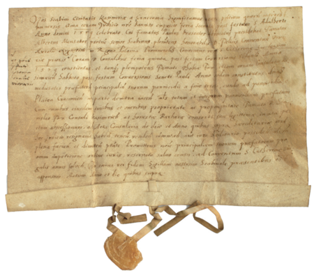 Dokument wystawiony w 1556 roku w Kazimierzu przez ławników kazimierskich w sprawie przeniesienia własności warsztatu sukienniczego na rajcę Stanisława Foxa, w zamian za roczny czynsz na rzecz klasztoru oo. Augustianów; przy dokumencie fragment kazimierskiej pieczęci ławniczej – oraz zbliżenie zapisu imienia i urzędu (Archiwum Narodowe w Krakowie, sygn. Aug. perg. 207)