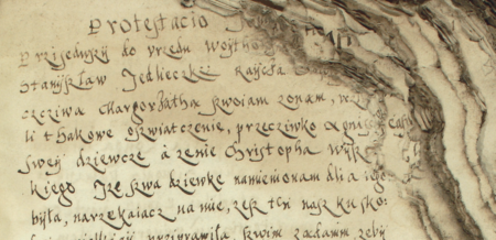 Z księgi wójtowskiej Kleparza obejmującej lata 1567–1571: początkowy fragment wpisu z 1568 roku dotyczącego sporu w rodzinie Stanisława Jedleckiego, rajcy kleparskiego – oraz zbliżenie zapisu imienia i urzędu (Archiwum Narodowe w Krakowie, sygn. KL 6, s. 4v)