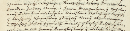 Z akt sądowych wielkorządcy krakowskiego obejmujących lata 1580–1583: fragment wpisu z 1582 roku dotyczącego sporu o zwrot pieniędzy przekazanych zmarłemu rajcy Stanisławowi Kałużnemu za jego życia – oraz zbliżenie zapisu imienia i urzędu (Archiwum Narodowe w Krakowie, sygn. Teut. 67, s. 257)